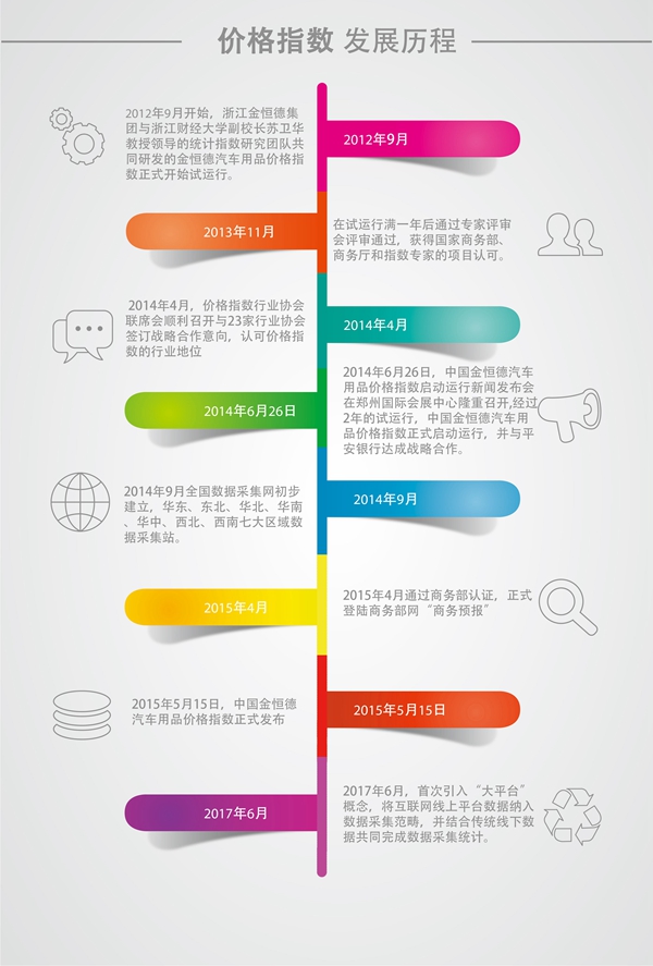 中國·金恒德汽車用品價格指數是汽車用品行業內得到國家商務部和行業認可的價格指數,并于2014年6月26日正式啟動運行。通過建立了平面、電視、網絡三位一體較為完善的發布體系,在國家商務部、浙江省商務廳和天臺縣政府官網上,按月發布月價格指數、景氣指數。