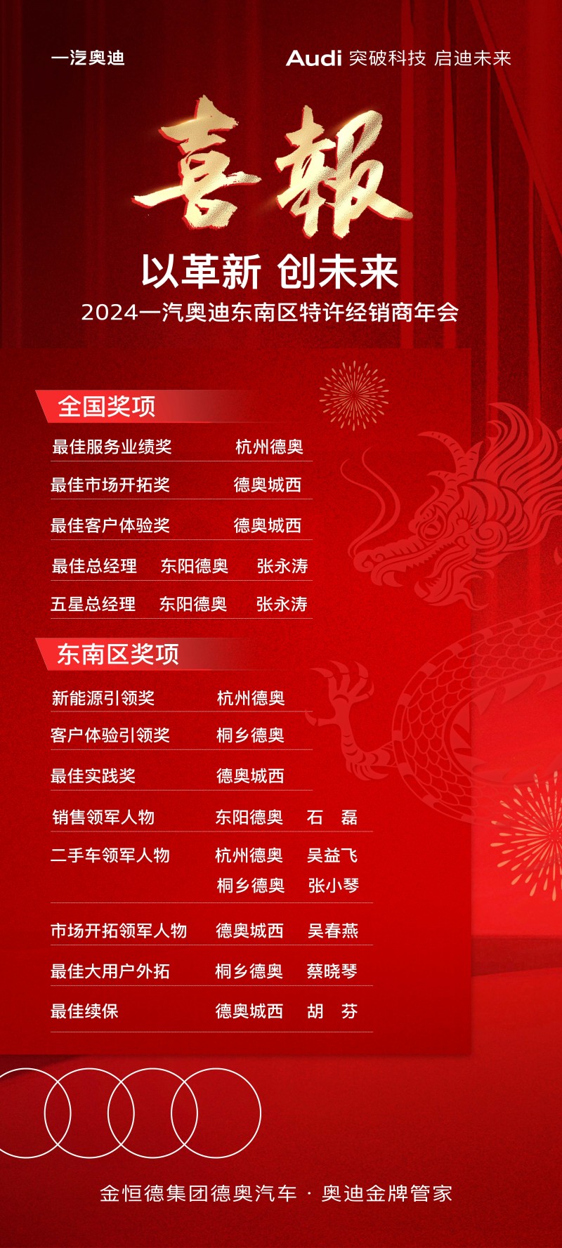 2024年1月24日,“以革新·創未來”2024一汽奧迪東南區特許經銷商年會隆重舉行。集團汽車板塊各奧迪店在全國經銷商網絡及東南區經銷商評比中,在諸多業務板塊中表現優異,收獲了各項榮譽。