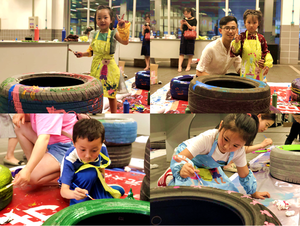 5月12日晚,在東陽德奧車間里廢舊的輪胎在小朋友們和大朋友的手上驚喜變身。孩子們的天真爛漫及豐富的想象力,展示在廢舊的輪胎上,爸爸媽媽們也化身為大畫家,和孩子們一起參與繪畫中,選手們或坐或趴,興致勃勃的在輪胎上信手涂鴉,一絲不茍,最后 “小黃人”、“七彩花園”、“霸王龍”等一件件涂鴉作品展現在眼前,廢舊的輪胎被賦予色彩,讓人耳目一新。
